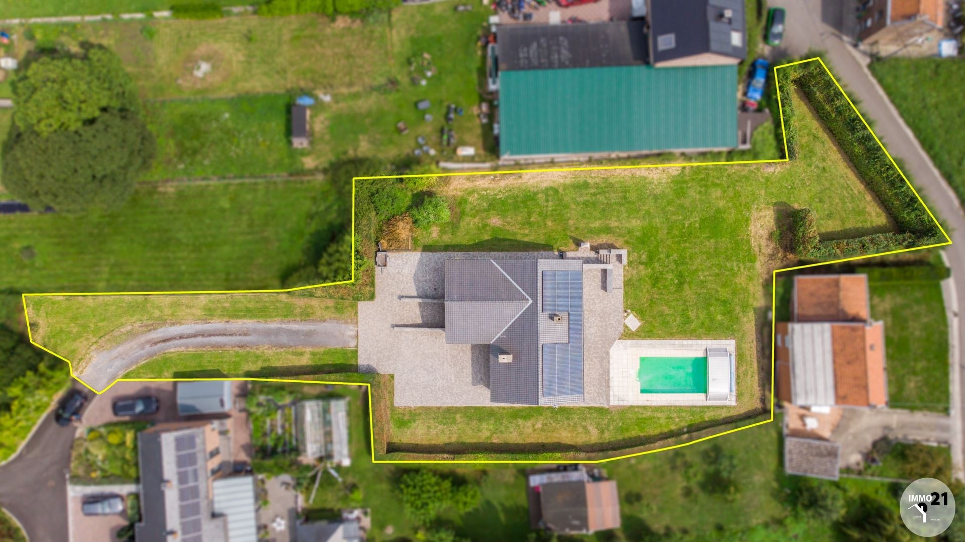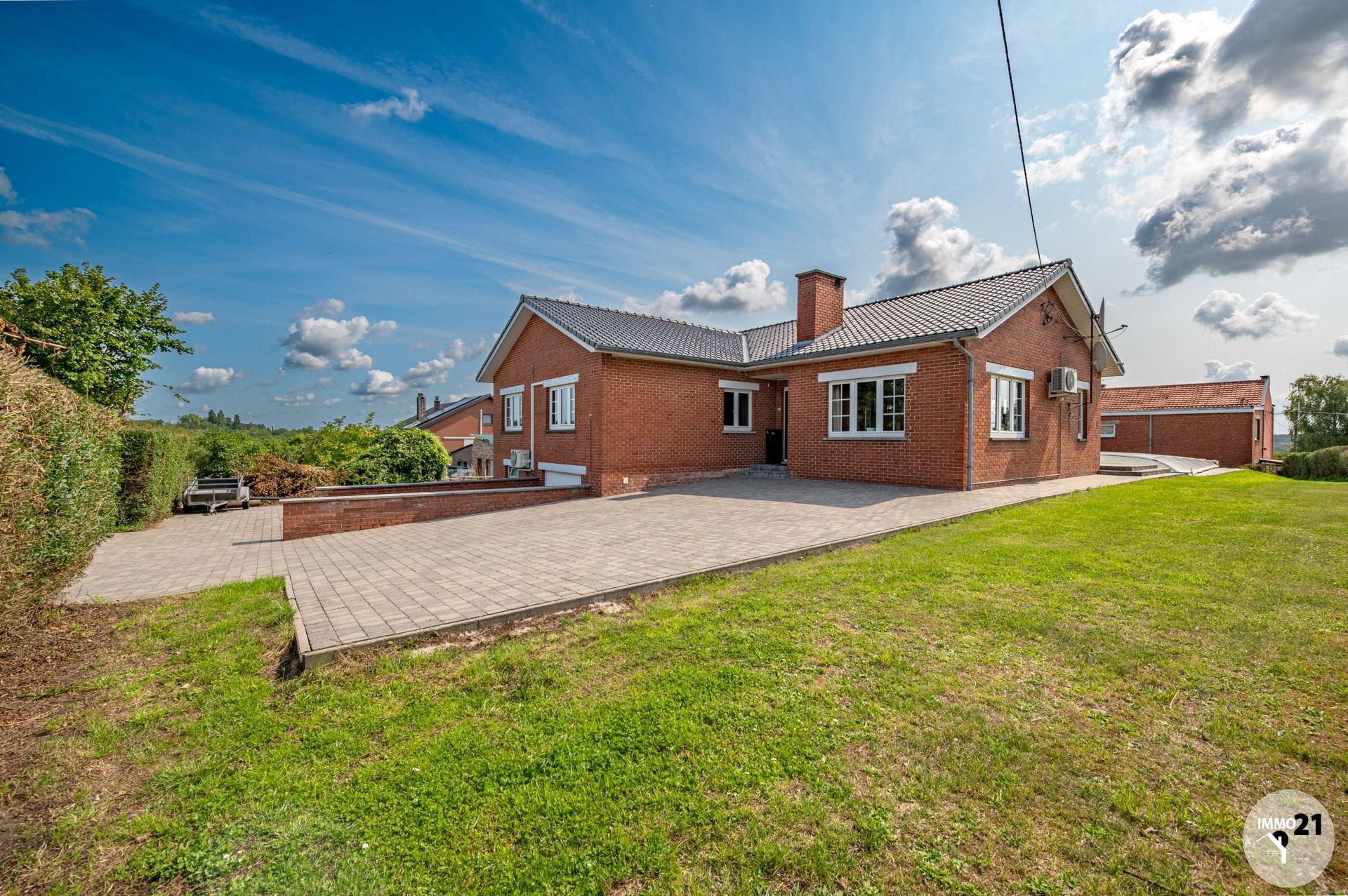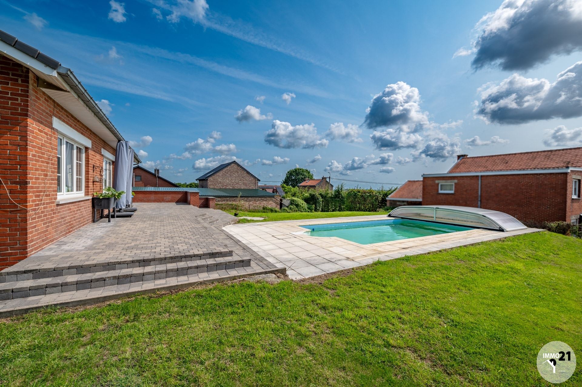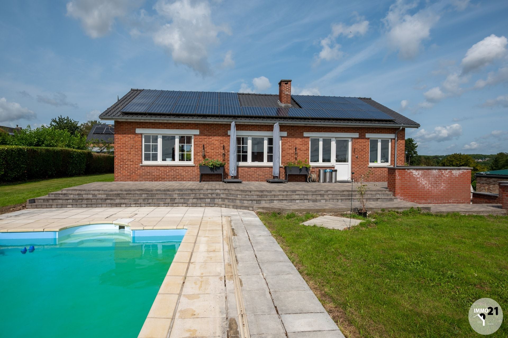 SAINT-GEORGES -SUR-MEUSE. L'agence IMMO21 vous propose ce bungalow 4 façades avec garage et grand jardin avec piscine ( 8 m x 4 m ). Composé comme suit: Hall d'entrée, wc, vestiaire, séjour ( 33 m² ), salle à manger, cuisine meublée équipée ( lave-vaisselle, four, hotte, frigo, évier ), salle de bain ( baignoire, meuble évier ), 4 belles chambres, buanderie, cave, garage. Grand jardin plat avec possibilité d'un second accès par la rue située à l'arrière, et offrant ainsi une parcelle à bâtir. Electricité réceptionnée, panneaux photovoltaïques ( 30 panneaux), châssis double vitrage, citerne d'eau de pluie, groupe hydrophore, adoucisseur d'eau, chauffage central, pompe à chaleur réversible, poêle à pellets, toiture en parfait état ( 2015 ). Le prix indiqué veut dire "faire offre à partir de 419.000€" Informations transmises sous réserve d'erreurs et non contractuelles.